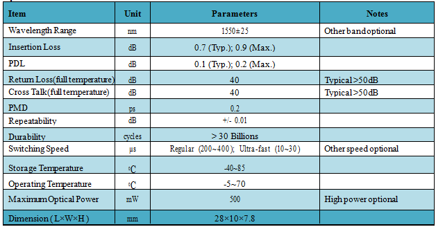 • Product description: 1x2or 2x1 optical switch is an all solid-state device without any moving parts. The switchingof the optical light is realized by utilizing Faraday Effect.